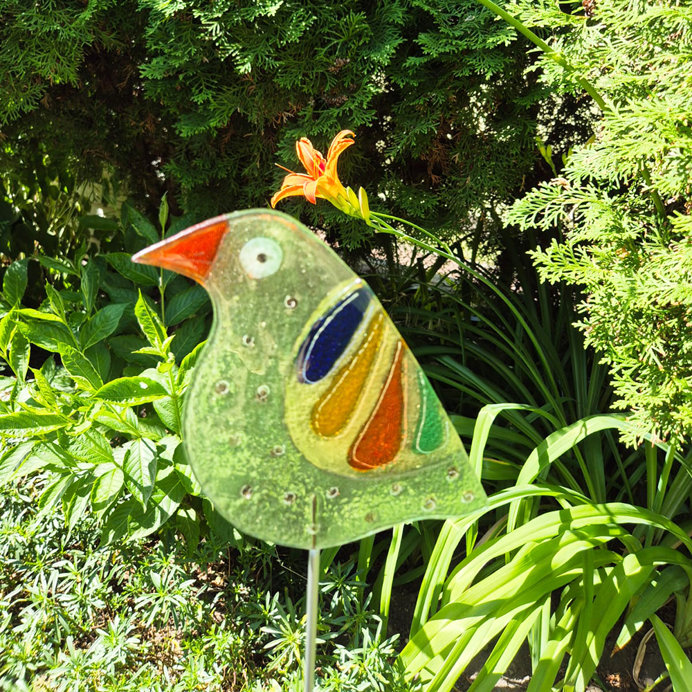 Szklany ptak do ogrodu to wyjątkowa dekoracja wykonana ręcznie metodą fusingu. Barwna kompozycja szkła stapianego w wysokiej temperaturze sprawia, że każdy ptak jest unikalny – pełen charakteru, koloru i lekkości. Doskonale prezentuje się wśród roślin, na rabatach, przy ścieżkach lub w donicach, nadając ogrodowi artystyczny i radosny akcent. Do każdej pracy dołączona jest rurka aluminiowa, która ułatwia stabilne umieszczenie ptaka w podłożu.