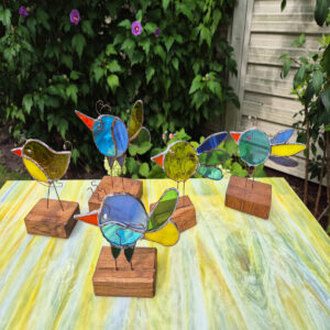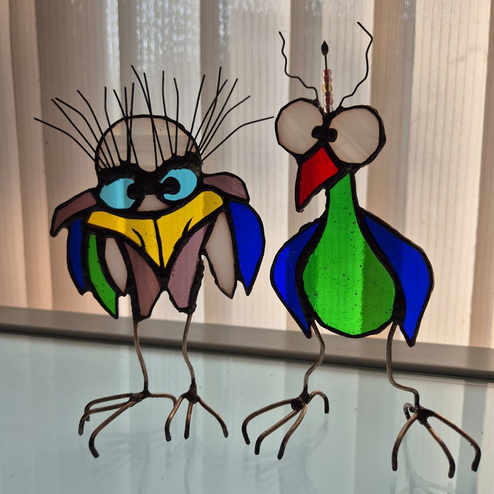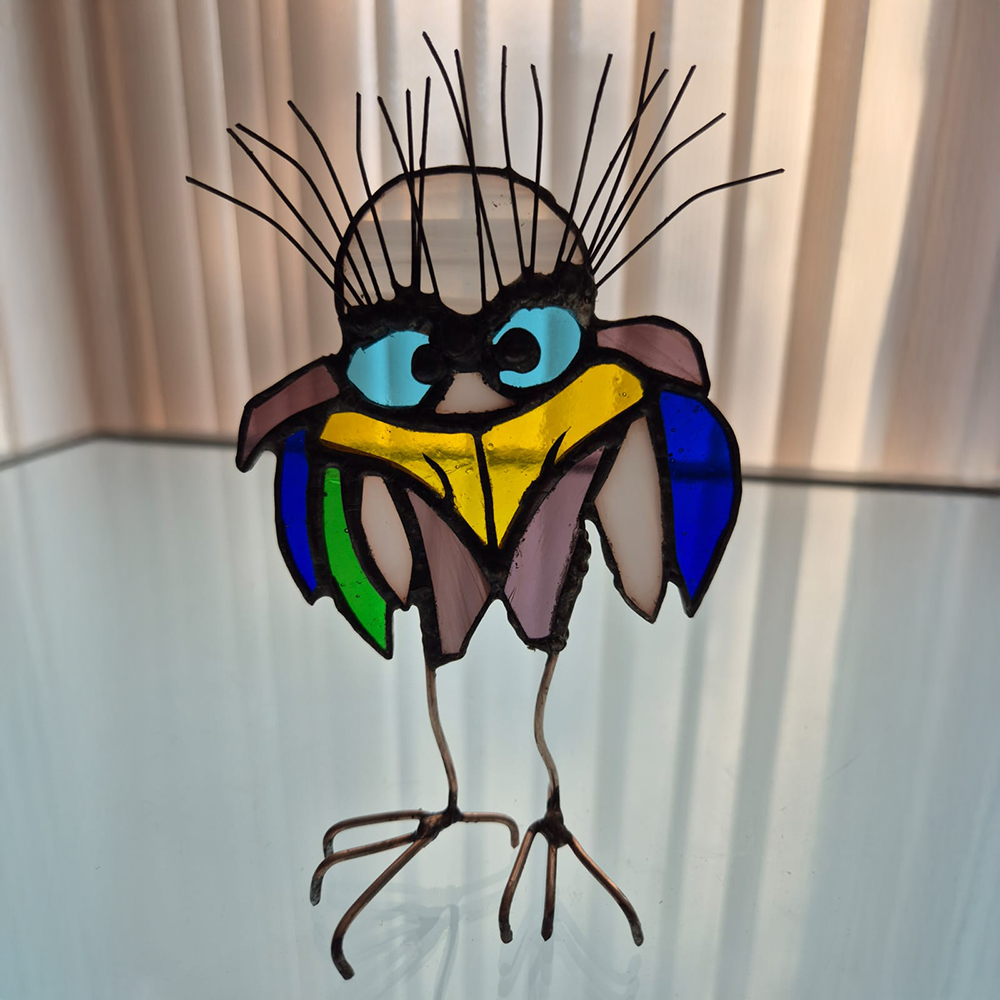 Stojący witraż w kształcie ptaka – ręcznie wykonana ozdoba ze szkła, która rozświetli i ożywi każde wnętrze.