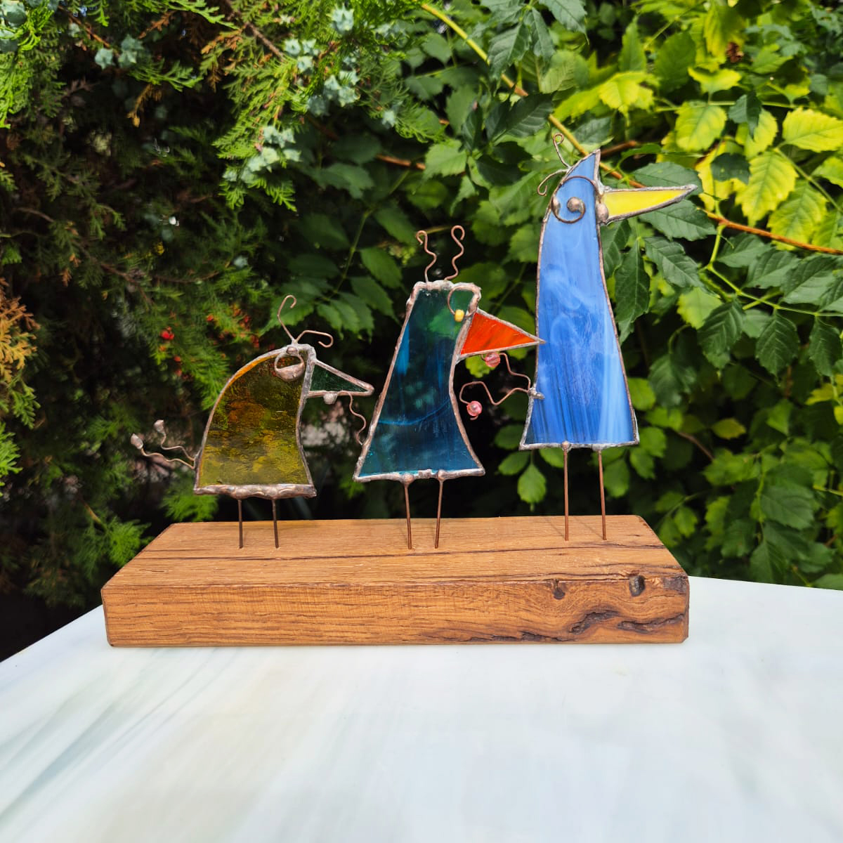 Witraże wykonane metodą Tiffany’ego. Po uprzednim przygotowaniu projektu, z tafli szkła witrażowego wycina się pojedyncze detale i odpowiednio szlifuje. Następnie owijamy każdy szklany element cieką miedzianą taśmą i łączymy za pomocą cyny.