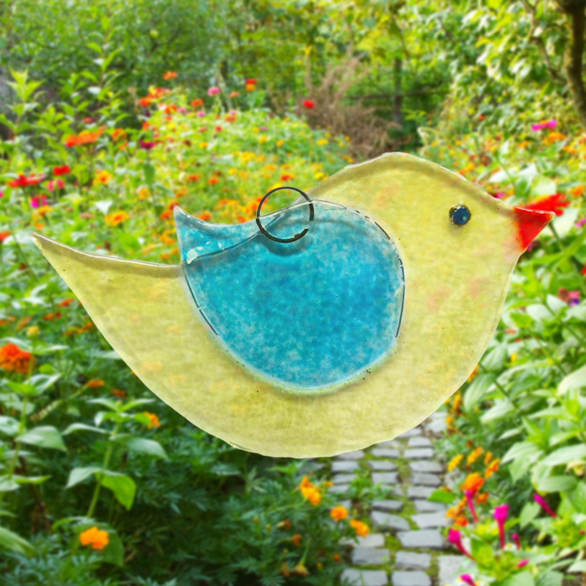 Praca wykonana i wcześniej ręcznie wyciętych elementów szklanych. Następnie udekorowano farbami do fusingu i wypalone w specjalistycznym piecu w temperaturze 810°C.