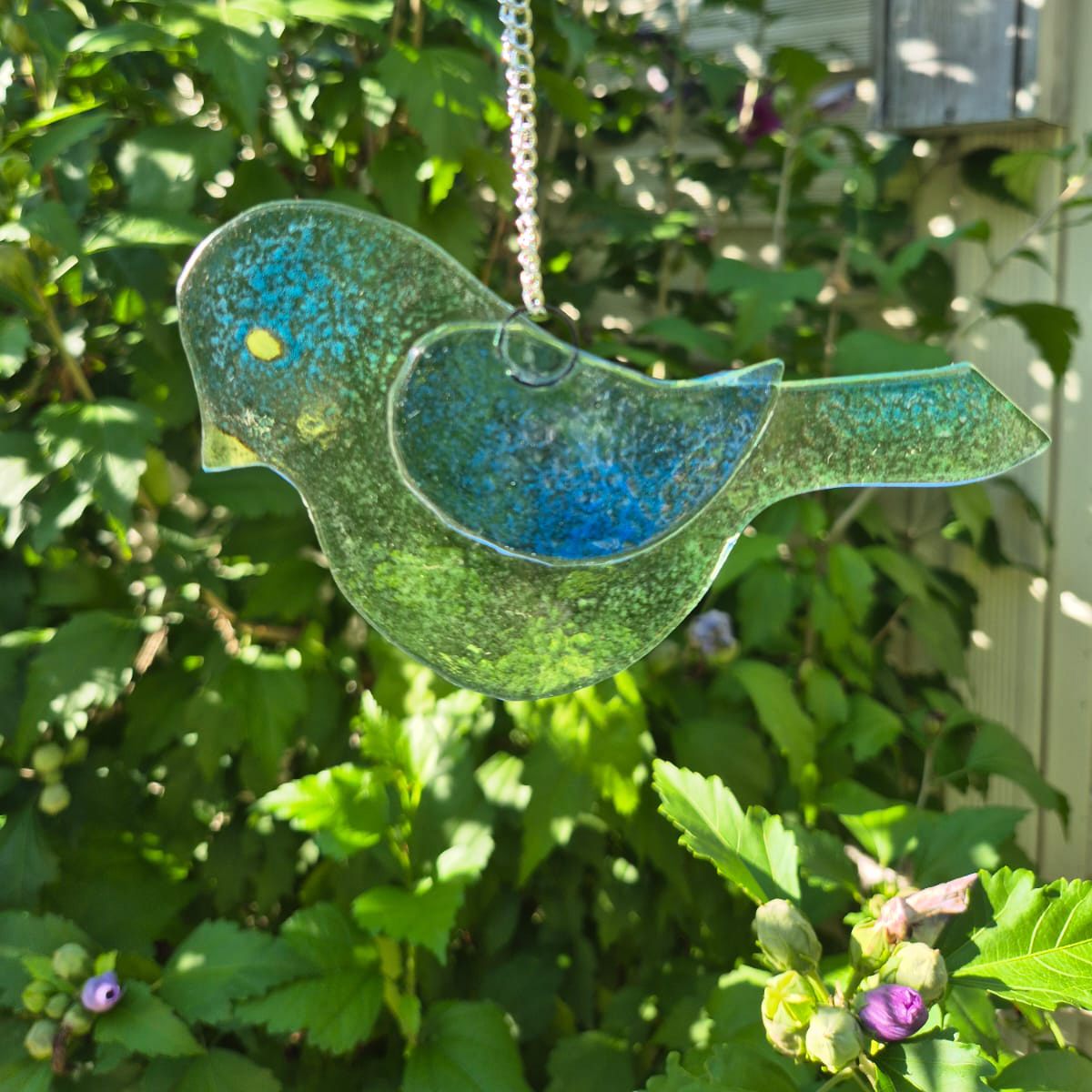 Praca wykonana i wcześniej ręcznie wyciętych elementów szklanych. Następnie udekorowano farbami do fusingu i wypalone w specjalistycznym piecu w temperaturze 810°C.