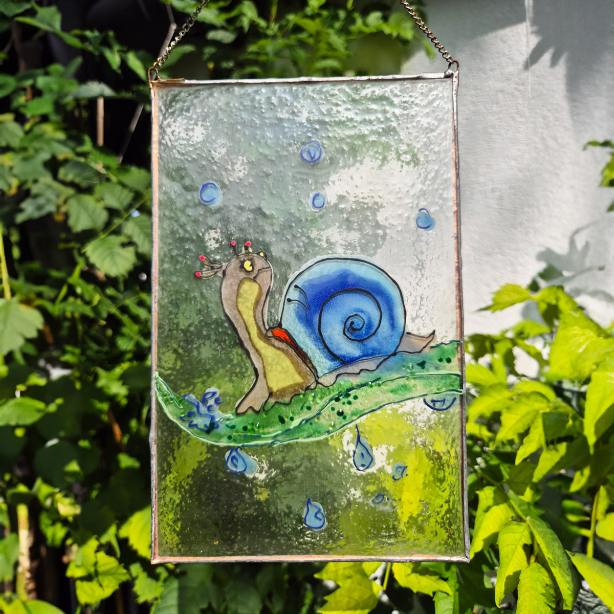 Kontury, kolory, dekoracyjne fryty nakładamy z każdej strony szkła co pozwala uzyskać głębie wykonanej pracy. Malunek utrwalany w procesie wypalania w piecu i jednocześnie dzięki procesowi zgrzewania i krystalizacji szkła wydobywamy piękno kolorów barw.