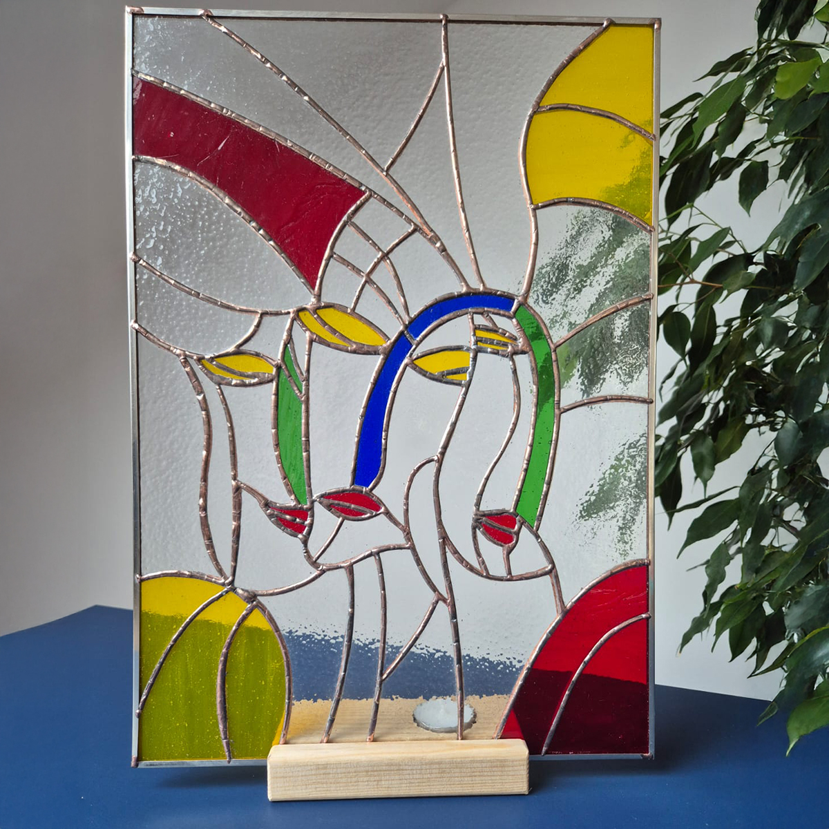 Witraże wykonane metodą Tiffany’ego. Po uprzednim przygotowaniu projektu, z tafli szkła witrażowego wycina się pojedyncze detale i odpowiednio szlifuje. Następnie owijamy każdy szklany element cieką miedzianą taśmą i łączymy za pomocą cyny.