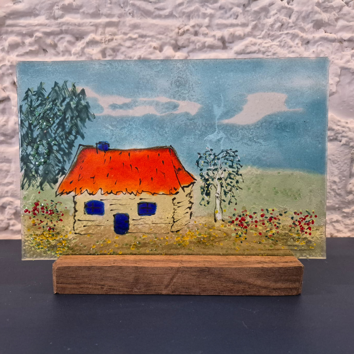 Urokliwa Wiejska Chata to ręcznie wykonana ozdoba stojąca, stworzona metodą fusingu – stapiania szkła w wysokiej temperaturze. Jej malowniczy, sielski motyw przywołuje atmosferę spokoju i domowego ciepła, a detale w ciepłych barwach nadają jej wyjątkowego charakteru.