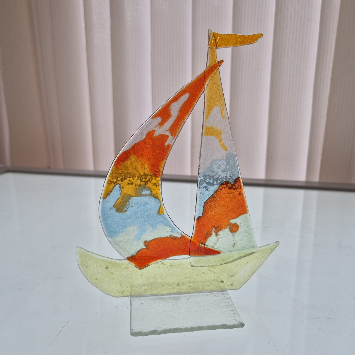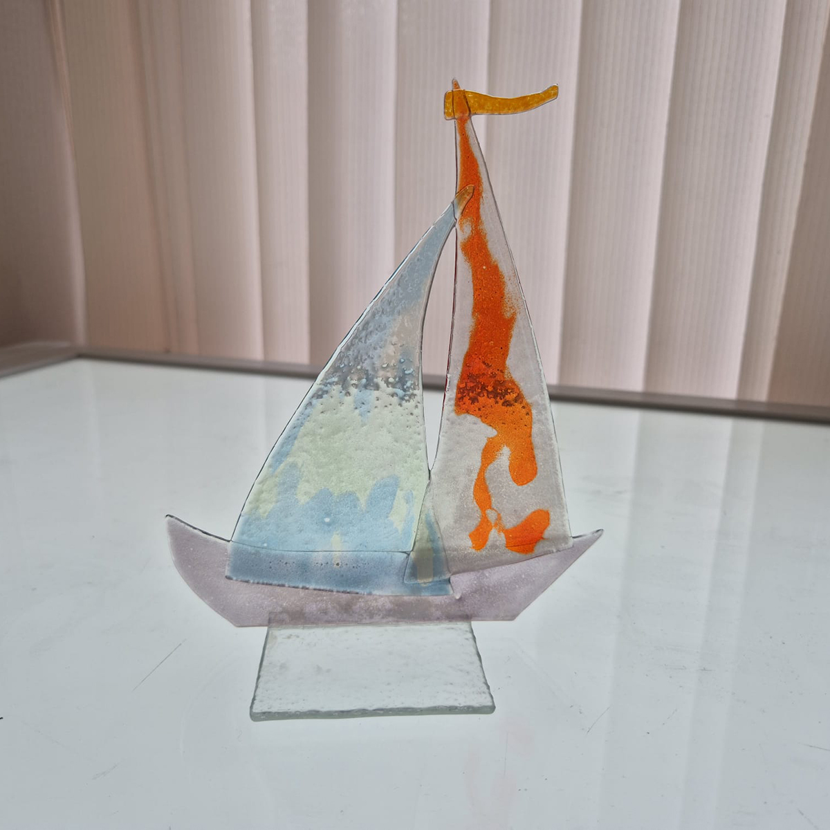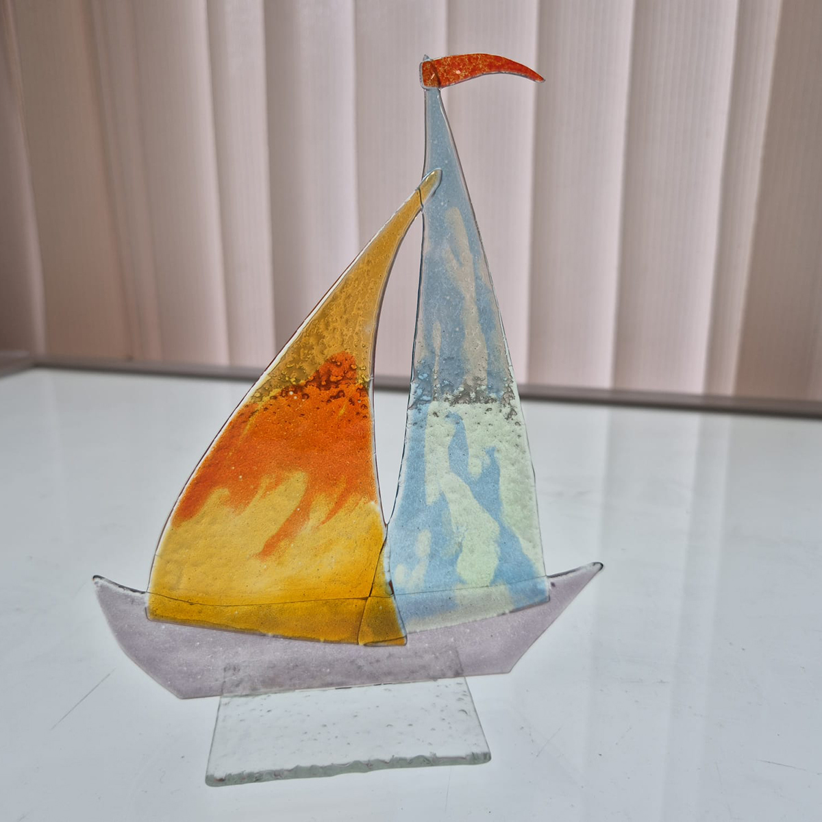 Żaglówka wykonana metodą fusingu – ręcznie wykonana stojąca ozdoba, która doda wnętrzu morskiego klimatu.