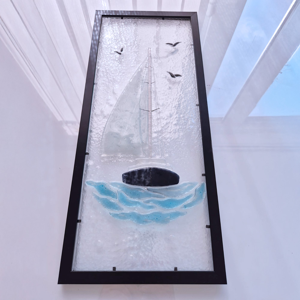 Szklana żaglówka w ramie – ręcznie wykonana dekoracja w technice fusingu, która wnosi do wnętrza lekkość i klimat morskiej przygody.