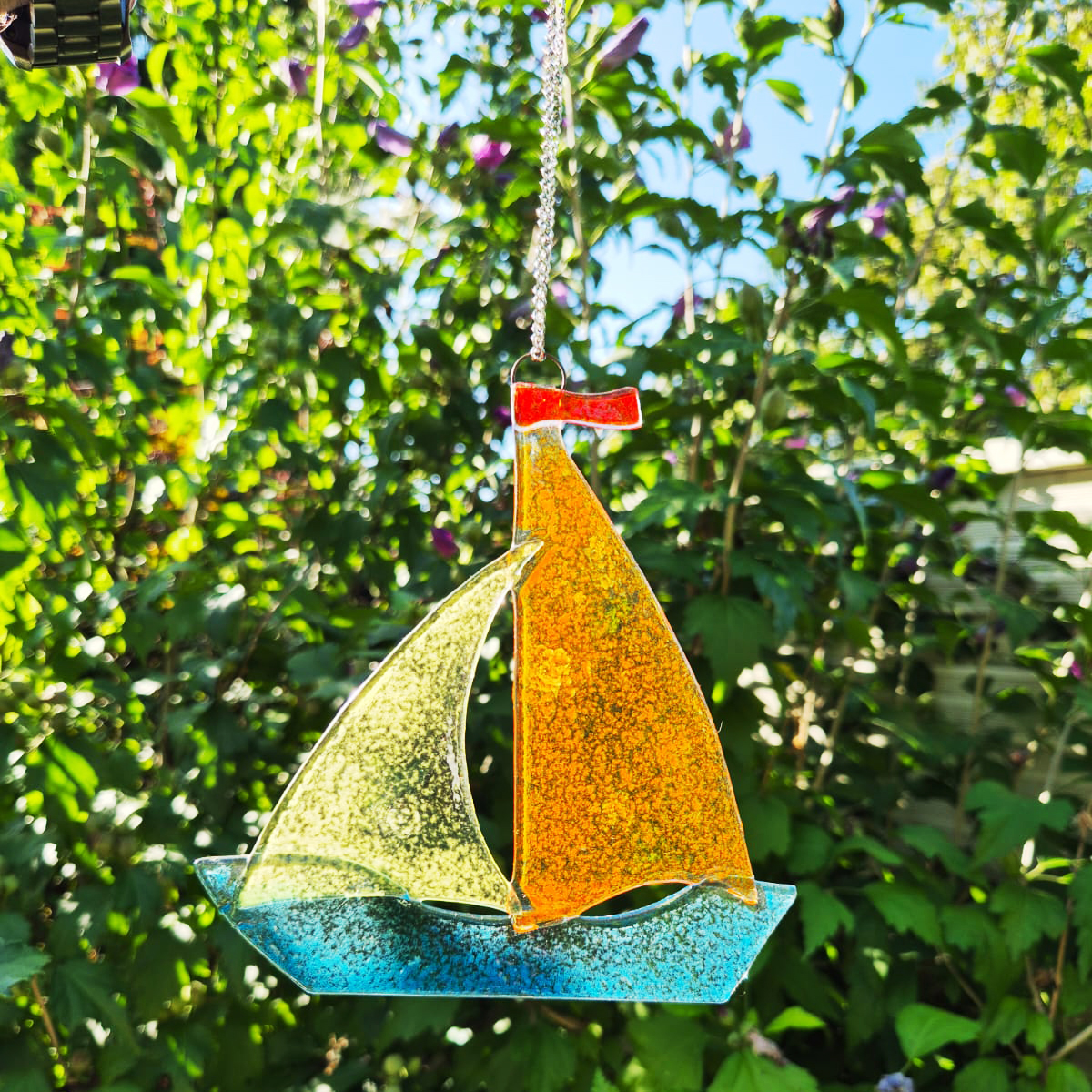 Praca wykonana i wcześniej ręcznie wyciętych elementów szklanych. Następnie udekorowano farbami do fusingu i wypalone w specjalistycznym piecu w temperaturze 810°C.