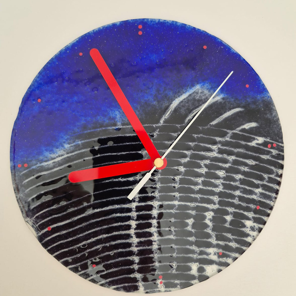 Zegar wykonany metodą fusingu to połączenie funkcjonalności z niepowtarzalną formą artystyczną. Abstrakcyjny wzór, uzyskany przez stapianie szkła w wysokiej temperaturze, tworzy unikalną kompozycję barw i kształtów. Każdy egzemplarz jest ręcznie wykonany, dzięki czemu żaden nie jest identyczny. To wyjątkowy akcent dekoracyjny, który doskonale sprawdzi się zarówno w nowoczesnych, jak i klasycznych wnętrzach, nadając im indywidualnego charakteru.