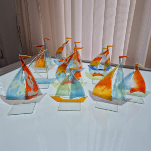 Rozpocznij Zakupy Już terazŻaglówka wykonana metodą fusingu – ręcznie wykonana stojąca ozdoba, która doda wnętrzu morskiego klimatu.