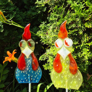 Kolorowy kogucik ze szkła z dołączoną rurką aluminiową – efektowna dekoracja do ogrodu, rabaty lub donicy.